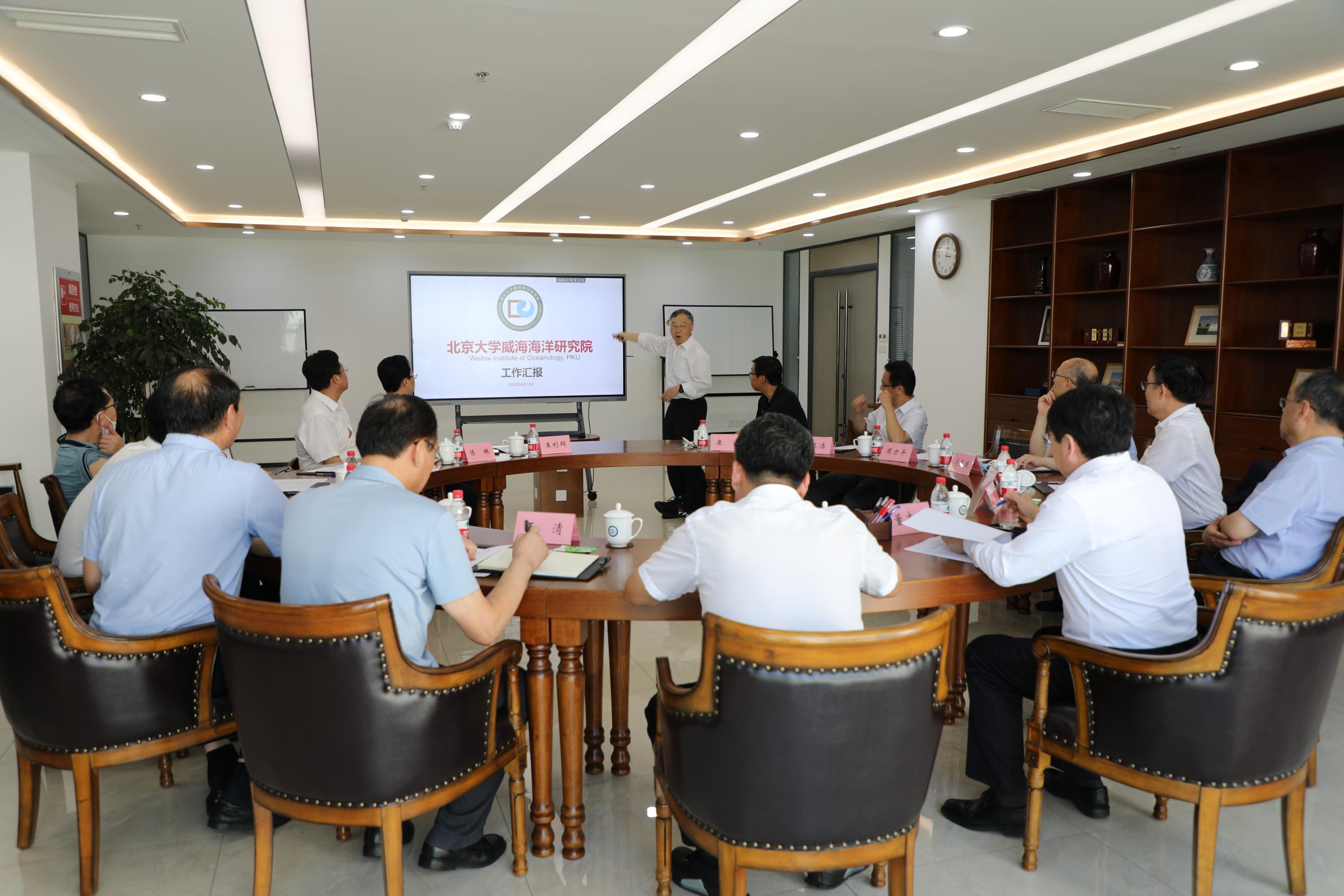 北京大学一行首先参观了北京大学威海海洋研究院办公楼等基础设施。在随后的座谈会中,北京大学威海海洋研究院院长周力平汇报了研究院的定位与使命、发展思路、海洋生物技术与应用创新平台建设及目前正在推进的项目。孙付春向北京大学一行介绍了威海的海洋优势及涉海产业发展建设情况。