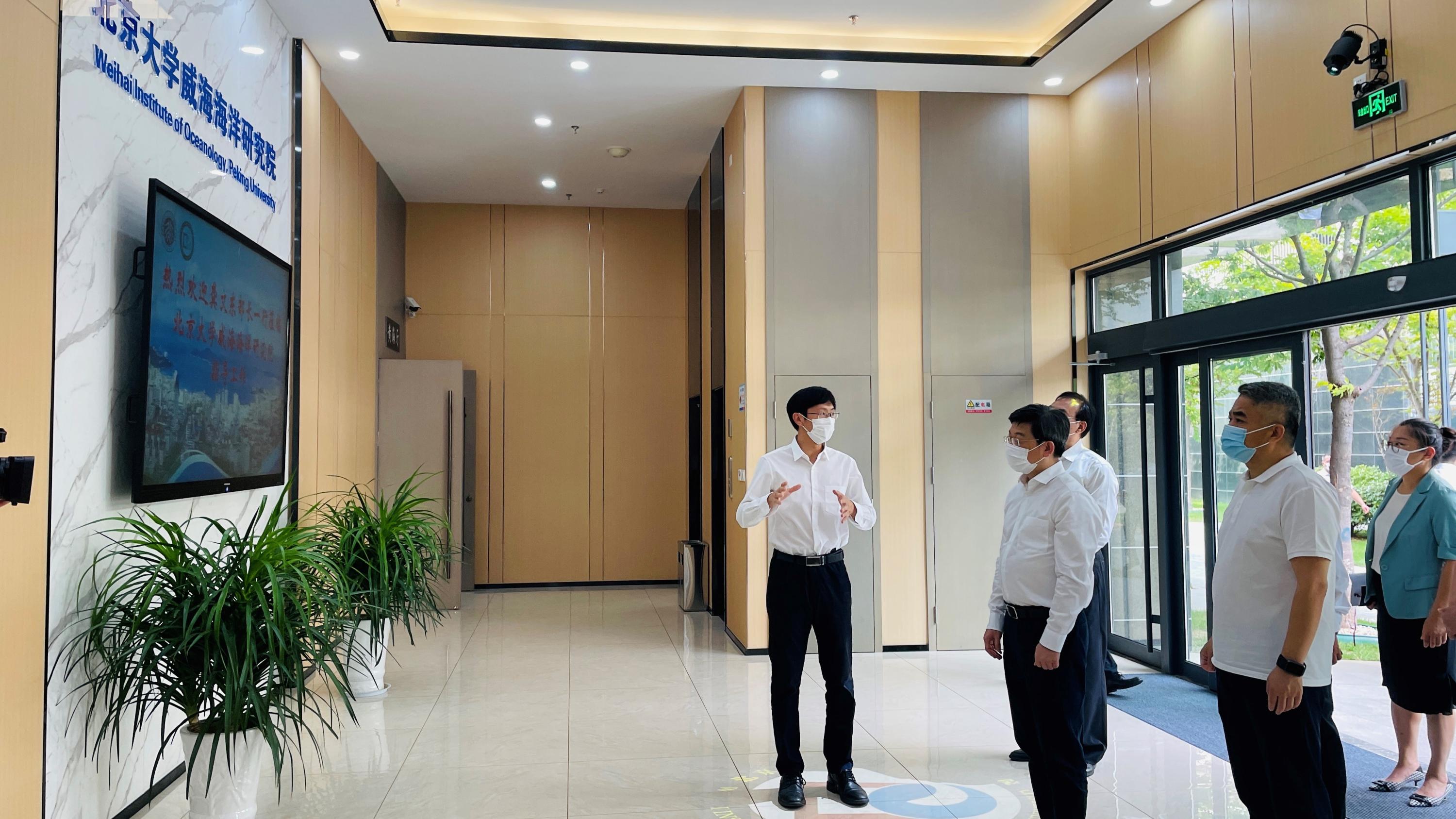 2022年8月25日,山东省委组织部副部长龚文东、省委组织部人才工作二处二级调研员刘炳宏、威海市委常委、秘书长李建,市委组织部副部长徐力,市委组织部副部长、市公务员局长潘晓鹏一行莅临北京大学威海海洋研究院调研指导,威海经济技术开发区党工委副书记、管委副主任王清、经济技术开发区党工委委员、党群工作部部长张国杰等陪同活动。