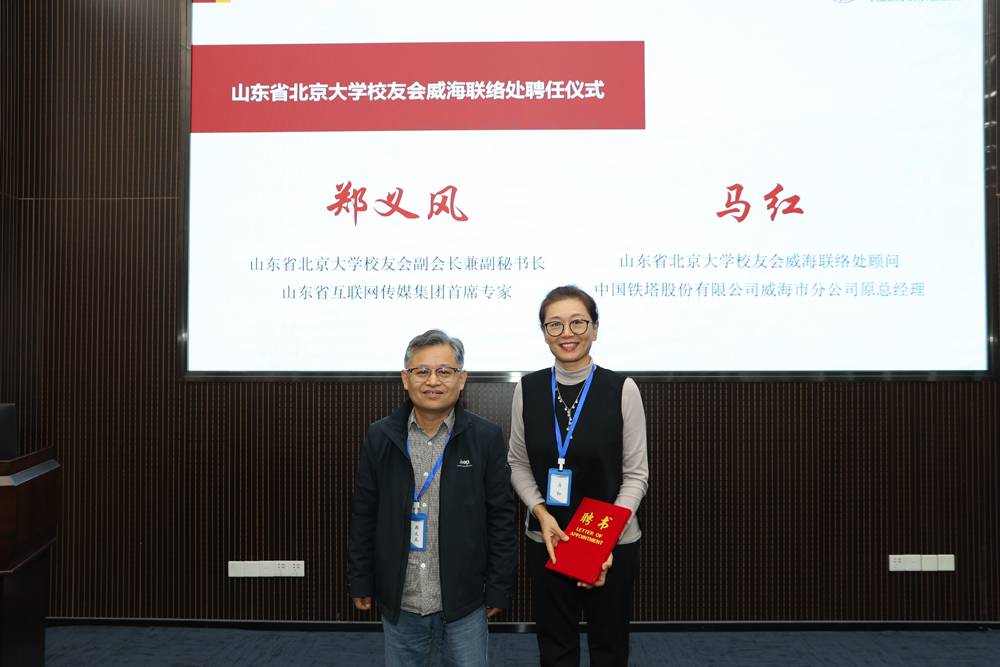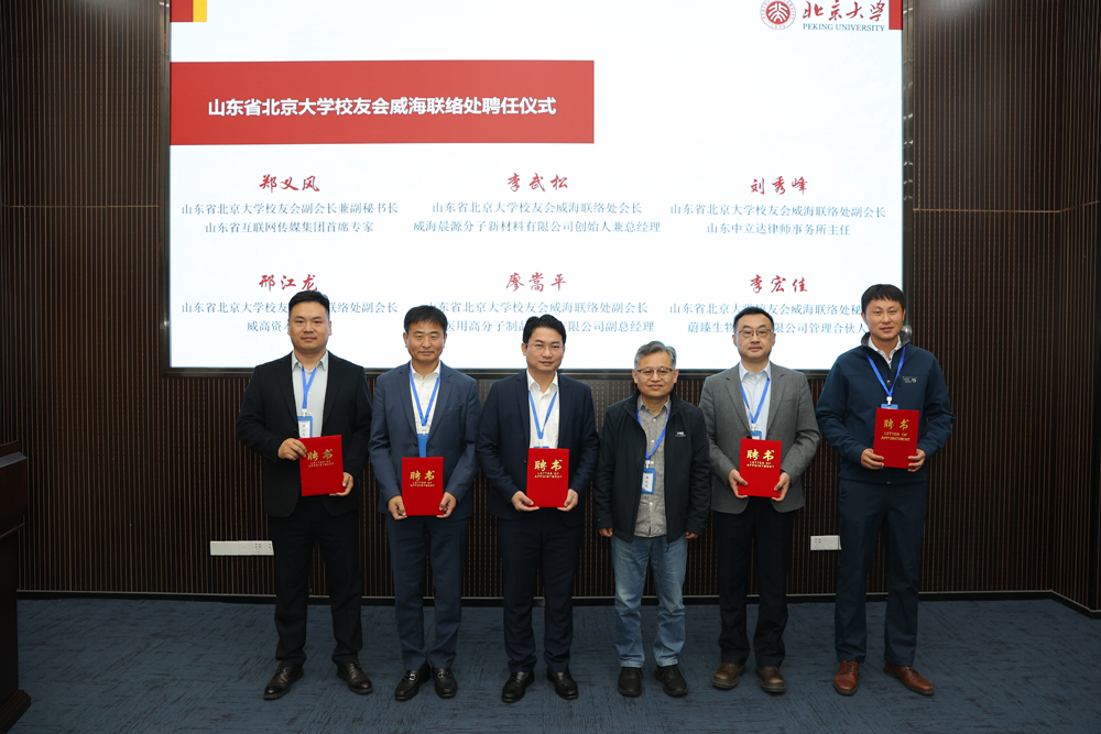 会上,倪胜希副会长宣读了《关于同意成立山东省北京大学校友会威海校友联络处的批复》,举行了“山东省北京大学校友会威海校友联络处”揭牌仪式和聘任仪式。