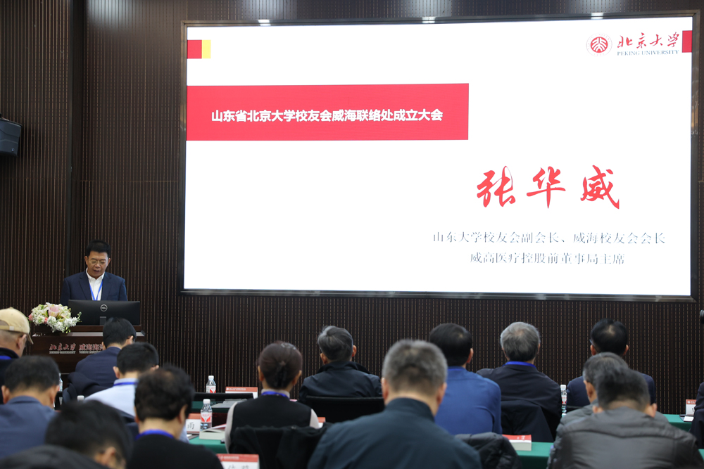 山东大学校友会副会长、威海校友会会长、威高国际医疗投资控股有限公司前董事局主席张华威代表兄弟校友会致辞,表示山东大学等校友会愿与北大校友会携手同行,在文化交流中互鉴互学、共同丰富威海的文化内涵,在人才培养上分享经验、为校友们提供更多指引与机会,在社会服务方面并肩合作,为威海以及山东的招才引智、繁荣发展贡献力量。