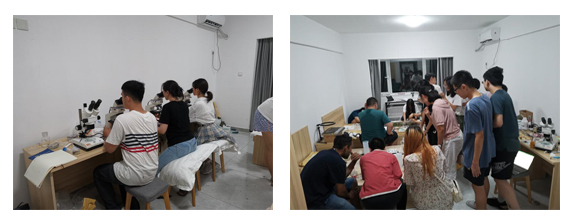 从7月26日起,同学们分为4组进行专题实习:《日本寄居蟹(Pagurusjaponicus)对螺壳及背景的颜色识别与选择》、《圆球股窗蟹进食行为对泥沙中浮游生物的影响》、《威海夏季大叶藻附生情况调查》、《入海闸口处藤壶附着影响因素分析》。在短短几天里,同学们克服首次实习实验条件简陋的困难,在住所制作标本和显微镜观察,以优异的成绩完成了专题研究。
