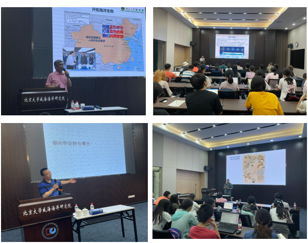 7月22日晚和7月23日上午,学术报告在北京大学威海海洋研究院黄海厅举行,林文翰(北大医学部)、贺新强、王戎疆、李晟和刘雪萍五位老师分别作了《海洋生物--人类健康》、《威海海滨潮间带常见大型海藻》、《潮间带无脊椎动物》、《威海鸟类》和《海洋遥感概述》的学术报告。报告的丰富内容为开展海岸实习提供了系统的基础理论知识,激起了同学们的强烈兴趣,大家踊跃提问。23日报告会前,北京大学威海海洋研究院院长周力平教授对生科院师生们的到来表示欢迎,并向大家介绍了研究院,在报告会后,带领同学们参观了研究院的图书馆等设施。
