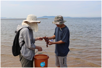 7月23日至7月29日,实习队师生先后前往文登长会口泥潭、威海高区小石岛和柳埠河砂滩学习识别海洋潮间带藻类、无脊椎动物及海滨高等植物和鸟类。其间还前往荣成寻山集团爱伦湾海洋牧场参观牧场展厅、微藻养殖车间、海洋牧场体验馆、海带育苗车间等,并学习了栉孔扇贝和海带苗种繁育技术科普课。